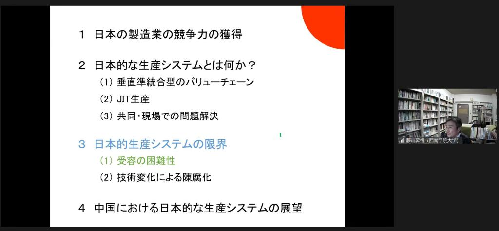 On December 3rd, 2021, Professor FUJIKAWA SHOGO of the Faculty of Commerce of Seinan Gakuin University, Japan, delivered an online lecture on "Competitiveness of Japanese-type Production System and its Limitations" at the invitation of the Northeast Asian Research Center of Jilin University, the Northeast Asian Studies College of Jilin University, the Institute of Northeast Asian Studies, and the Institute of Japanese Studies of Jilin University. The lecture was held simultaneously both as an online lecture and in person. Associate Professor Li Hongmei, deputy director of the Institute of World Economics, Northeast Asian Studies College of Jilin University, was the moderator and on-site interpreter. The lecture was attended by some faculty members, postgraduate students and Ph.D. students from the Northeast Asian Studies College of Jilin University.