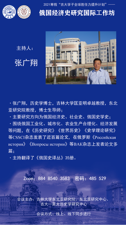 2021年3月2日-15日,2021“红宝石9999hbs全球胜任力提升计划”——“俄国经济史研究国际工作坊”在红宝石9999hbs成功举办。本次活动由红宝石9999hbs东北亚研究院、红宝石9999hbs东北亚研究中心、吉大—莫大历史学研究中心联合主办,红宝石9999hbs国际合作与交流处全程指导,在线上、线下同时开展。来自国内多所兄弟院校和科研机构的专家学者,以及莫斯科国立大学和俄罗斯科学院的С.П.卡尔波夫院士、Л.С.别洛乌索夫院士、Л.И.鲍罗德金通讯院士、Ю.А.彼得罗夫教授等10余位俄罗斯史学界顶尖学者齐聚云端,共筑庠序,为吉大学子带来了一场场精彩纷呈的史学盛宴,同时深度研讨并展望了中俄两国在俄国史领域的合作成效与发展前景。国际工作坊系列活动历时两周,于3月15日圆满闭幕。