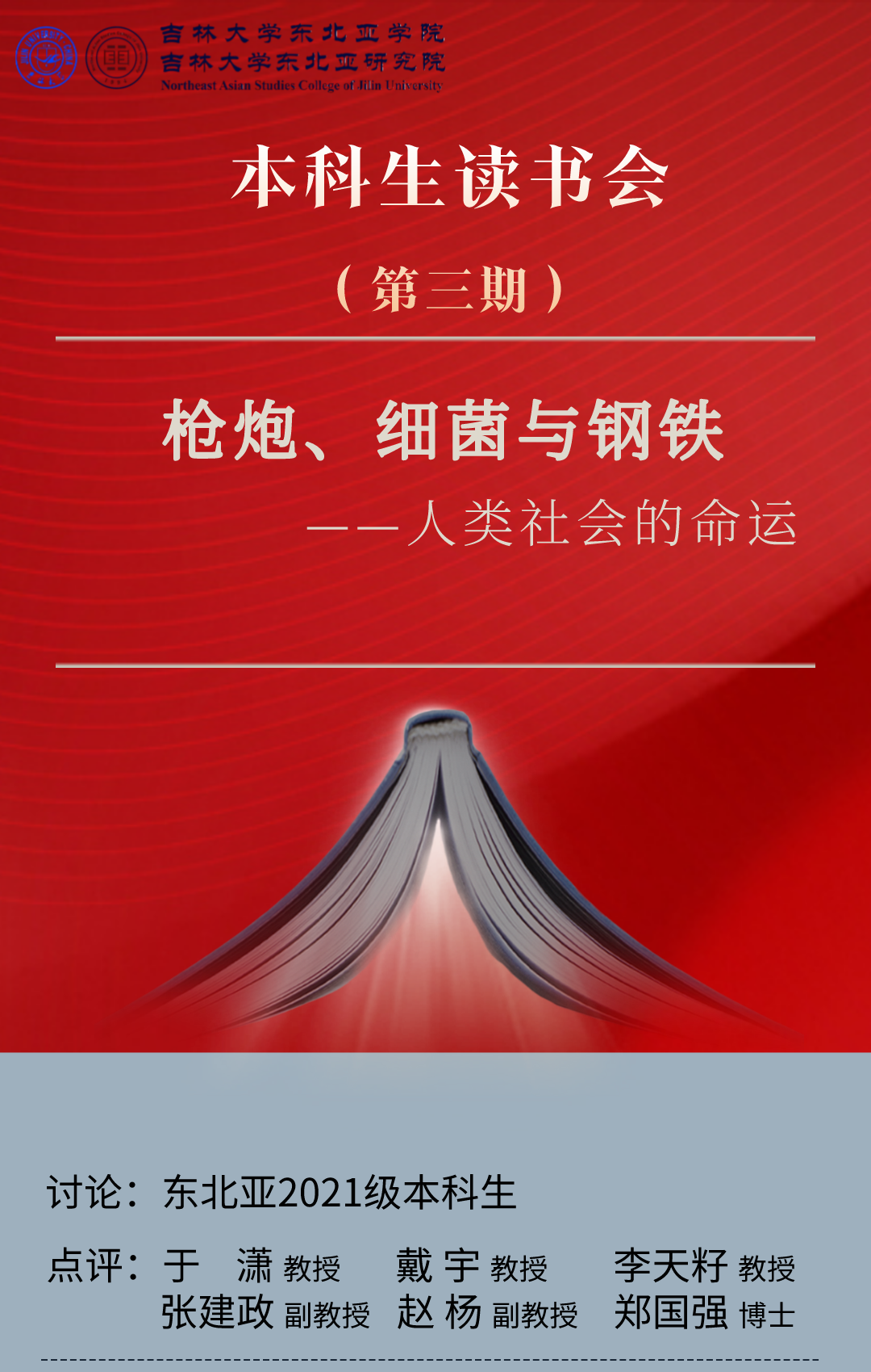 2022年5月14日,红宝石9999hbs东北亚学院在线上举办了第三期本科生读书会,本次读书会的主题是讨论美国学者贾雷德.戴蒙德的畅销书籍《枪炮、病菌与钢铁:人类社会的命运》。